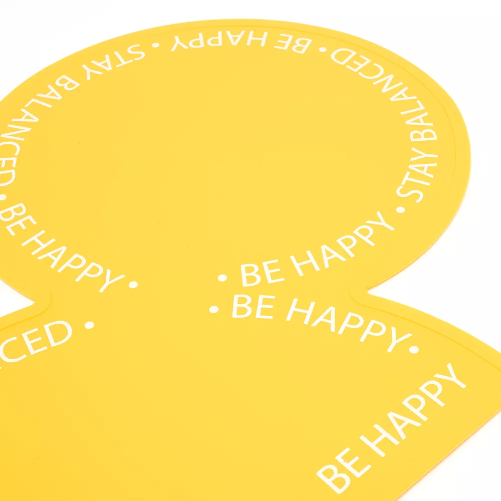 - Inscriptions « Be happy » (Soit heureux) et « Stay balanced » (Garde un équilibre) sur les bords